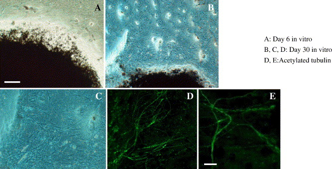 Fig. 7. Organotypic cultures of the RPE with attached choroid. RPE sheet with choroid was cultured on a filter membrane. (A) Day 6 in vitro (B, C, D, E) Day 30 in vitro. RPE cells begin to migrate out onto the filter membrane by Day 6, where they start to depigment and transform into fiber-like cells with long branching processes. (D, E) shows a culture stained with anti-acetylated tubulin. Scale bar in A is 50 μm and is applied to B, C, D. Bar in E is 10 μm.