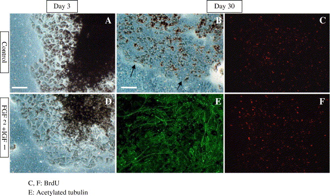 Fig. 8. Organotypic cultures of isolated RPE on Day 3 (A, D) and on Day 30 (B, C, E, F). RPE sheet was separated from the choroid and cultured on a filter membrane. (A, B, C) show cultures without FGF-2 and IGF-1, and (D, E, F) show cultures with both factors. (C, F) show BrdU labeling and (E) shows acetylated tubulin staining. In control cultures (A, B), RPE cells proliferated but remained mostly pigmented, while addition of FGF-2 and IGF-1 induces RPE cells to proliferate, depigment and differentiate into neural cells, as shown by acetylated tubulin immunocytochemistry (E). Arrows in B indicate the peripheral edge of the epithelial sheet. Scale bar in A is 20 μm and is applied to D. Scale bar in B is 30 μm and is applied to C, E, F.