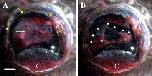 Fig. 1. Surgical operation for retinectomy of Xenopus eye. (A) An incision was made along the dorsal boundary of the iris (yellow arrows). The retinal vascular membrane (RVM) is visible on the whitish retinal tissue. White arrow indicates blood vessels of the RVM. C: cornea. (B) For surgical retinectomy, RVM was turned out towards the lens. Immediately after removal of the retinal tissue, the RVM was put back again to the ocular cavity as shown in B. Arrowheads deliminate the peripheral edge of RVM and asterisks indicate blood cell clusters. Scale bar is 500 μm.