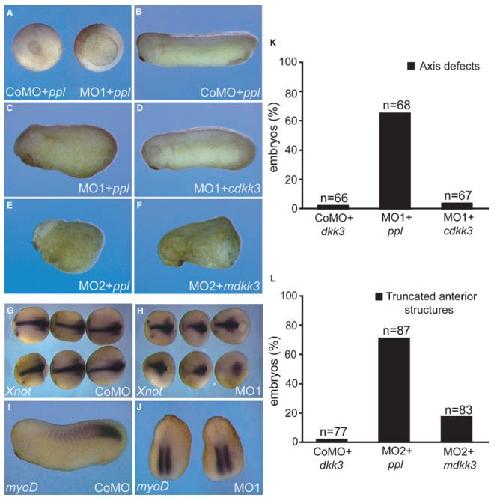 Fig. 2 Dkk3 is required for Xenopus axis formation. (AâJ) One- to two-cell embryos were injected with two dkk3 Morpholino antisense oligonucleotides (MO1, MO2) or control Morpholino (CoMO) and in combination with the following mRNA: 2 ng preprolactin (ppl) (AâC, E), 2 ng chicken dkk3 (D), or 2 ng mouse dkk3 (F). (GâI) Whole-mount in situ hybridization of Xnot and myoD in Morpholino- injected embryos as indicated. (KâL) Statistical analysis of phenotypes is described in (BâF).