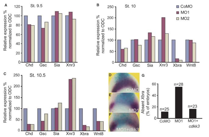 and the partial rescue by chicken dkk3 mRNA (F). (G) Quantitation of embryos with gaps in Xbra staining as described in (DâF).