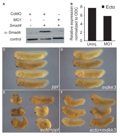 harvested at stage 10.5 for Western blot analysis of Smad4. (B) Two-cell stage embryos were injected with dkk3 MO1 and expression of Xectodermin was
