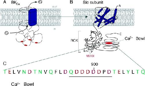 Figure 1. . General topology of the BKCa channel. (A) Diagram of the fourfold-symmetric BKCa channel, composed of four “slo” subunits. (B) Putative topology of a single subunit. Apparent is the integral-membrane domain (based loosely on the recent structure of the KvAP channel; Jiang et al., 2003) and the intracellular domain. In the latter are indicated the RCK domain, whose representation was modeled after the structure of the MthK channel's RCK domain (Jiang et al., 2002), and the Ca2+ bowl, whose structure is unknown. (C) Amino acid sequence of the Ca2+ bowl. Residues with acidic side chains are indicated in red. Other oxygen-containing side chains are indicated in green. Side chains without oxygen are indicated in black.