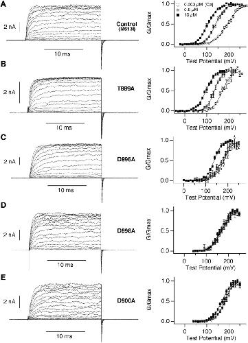 Figure 3. . Three classes of Ca2+-bowl point mutants. Shown are data from (A) our control (M513I) channel, (B) a mutant that showed little change in Ca2+ response, (C) a mutant whose Ca2+ response was reduced by approximately half, and (D and E) two mutants whose responses to 10 μM [Ca2+] were essentially eliminated. On the left are current families (10 μM [Ca2+]) representative of those used to generate the G-V curves on the right. Voltages are as follows. Control (M513I): hold −50 mV, test 0–180 mV. T889A: hold −80 mV, test 0–180 mV. D895A: hold −50 mV, test 0–200 mV. D898A: hold −50 mV, test 40–220 mV. D900A: hold −50 mV, test 40–230 mV. All repolarization were to −80 mV. G-V Boltzmann fit parameters where as follows. Control: as in the legend to Fig. 2. T899A: 0.003 μM [Ca2+] V1/2 = 172 mV, z = 1.21; 0.8 μM [Ca2+] V1/2 = 135 mV, z = 1.46; 10 μM [Ca2+] V1/2 = 96 mV, z = 1.24. D895A: 0.003 μM [Ca2+] V1/2 = 181 mV, z = 1.24; 0.8 μM [Ca2+] V1/2 = 173 mV, z = 1.08; 10 μM [Ca2+] V1/2 = 138 mV, z = 1.42. D898A: 0.003 μM [Ca2+] V1/2 = 170 mV, z = 1.06; 0.8 μM [Ca2+] V1/2 = 169 mV, z = 1.14; 0.8 μM; 10 μM [Ca2+] V1/2 = 163 mV, z = 1.17. D900A: 0.003 μM [Ca2+] V1/2 = 182 mV, z = 1.34; 0.8 μM [Ca2+] V1/2 = 182 mV, z = 1.33; 10 μM [Ca2+] V1/2 = 169 mV, z = 1.22.