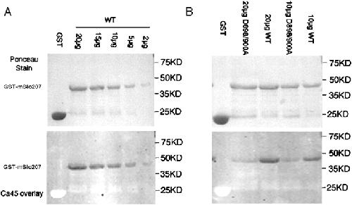Figure 7. . Ca2+ bowl mutations greatly reduce Ca2+ binding to a mSlo fusion protein. (A, top) Ponceau-stained electroblot from and SDS-PAGE gel showing an increasing amount of loaded GST-mSlo207 fusion protein. On the far left 16 μg of GST alone was loaded as a negative control. (A, bottom) Autoradiogram of the blot in the top panel after 45Ca2+ overlay and wash. Note the increasing signal with increasing protein concentration. (B, top) Ponceau-stained blot from a gel that had loaded onto it 10 and 20 μg of GST-mSlo207 and the mutant GST-mSlo207-D898A/D900A as indicated. On the far left 16 μg of GST alone was loaded as a negative control. (B, bottom) Autoradiogram of the blot in the top panel after over lay with 12 μM 45Ca2+ and wash.