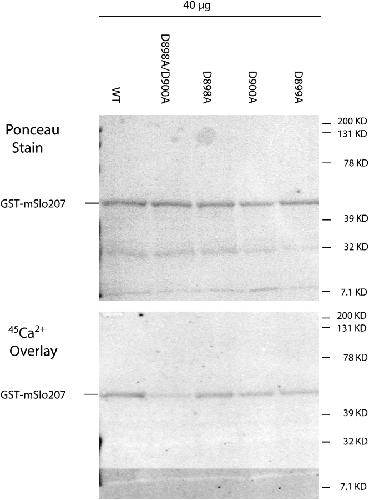 Figure 9. . Ca2+ binding to four Ca2+-bowl mutant fusion proteins. (Top) Ponceau-stained blot from a gel that had loaded onto it 40 μg of GST-mSlo207 and the mutants GST-mSlo207-D898A/D900A, GST-mSlo207-D898A, GST-mSlo207-D900A, and GST-mSlo207-D899A as indicated. (Bottom) Autoradiogram of the blot in the top panel after 45Ca2+ overlay (9.1 μM [Ca2+]) and wash.