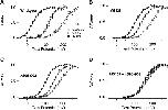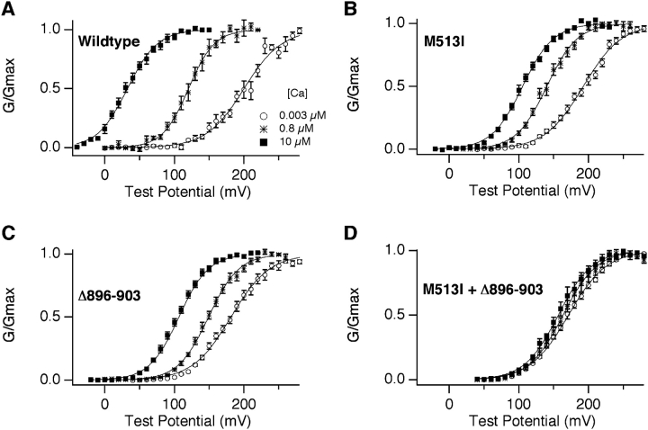 Figure 2. . mSlo mutations that eliminate high-affinity Ca2+ sensing. Average normalized G-V relations determined at 0.003, 0.8, and 10 μM internal [Ca2+]. Data are from inside-out Xenopus oocyte macropatches expressing cRNA from either (A) wild-type mSlo, (B) the RCK mutant M513I, (C) the Ca2+-bowl deletion mutant Δ896–903, or (D) the double mutant M513I + Δ896–903. Notice each mutation eliminates half of the channel's Ca2+-induced G-V shift. Each G-V curve is fitted with a Boltzmann function whose parameters where as follows. Wild-type: 0.003 μM [Ca2+] V1/2 = 200 mV, z = 0.93; 0.8 μM [Ca2+] V1/2 = 120 mV, z = 1.36; 10 μM [Ca2+] V1/2 = 32.8 mV, z = 1.18. M513I: 0.003 μM [Ca2+] V1/2 = 193 mV, z = 0.92; 0.8 μM [Ca2+] V1/2 = 140 mV, z = 1.16; 10 μM [Ca2+] V1/2 = 106 mV, z = 1.14. Δ896–903: 0.003 μM [Ca2+] V1/2 = 182 mV, z = 0.92; 0.8 μM [Ca2+] V1/2 = 149 mV, z = 1.17; 10 μM [Ca2+] V1/2 = 105 mV, z = 1.23. M513I + Δ896–903: 0.003 μM [Ca2+] V1/2 = 172 mV, z = 0.93; 0.8 μM [Ca2+] V1/2 = 164 mV, z = 1.05; 10 μM [Ca2+] V1/2 = 157 mV, z = 1.05. These data have been discussed previously in Bao et al. (2002). Error bars here and elsewhere indicate standard error of the mean.