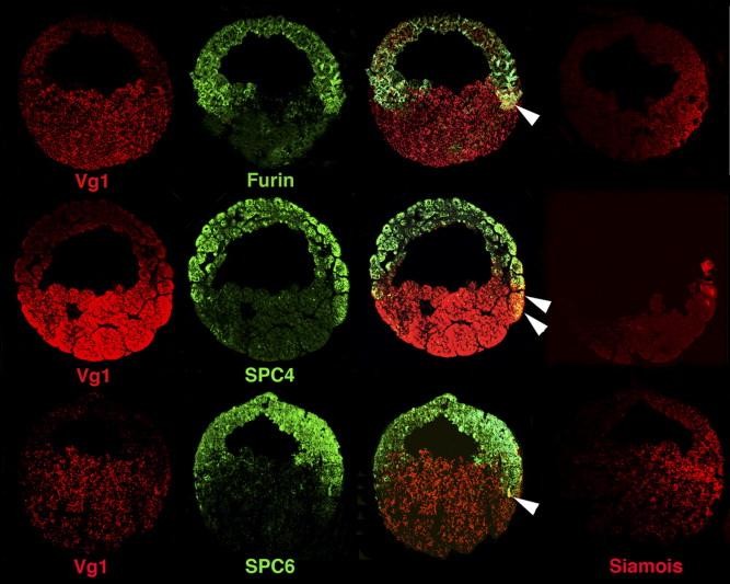 Fig. 3. Spatial distribution of Vg1 and SPCs in sections of stage 9 Xenopus blastulae. Panels show Vg1 expression in red and Furin, SPC4, and SPC6 in green. The double-label images indicate the specific overlapping expression patterns of Vg1with Furin, SPC4, and SPC6 (indicated by white arrows) on the dorsalâvegetal side of the embryo, in the region of the Nieuwkoop center. Adjacent sections were probed with Siamois to confirm dorsalâventral orientation of the embryos.