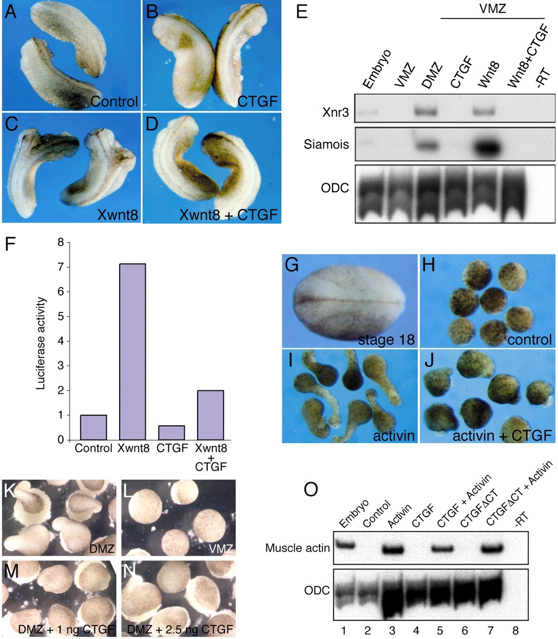 Fig. 3. CTGF inhibits WNT signalling. (A-D) Induction of duplicated axes by Xwnt8 is inhibited by CTGF. (A) Control embryos at stage 28. (B-D) Embryos were injected at the 4-8-cell stage into one ventral-vegetal blastomere with RNA encoding CTGF alone (B), Xwnt8 alone (C), or both (D). Secondary axis induction is inhibited by CTGF. (E) CTGF inhibits induction of Xnr3 and Siamois by Xwnt8. Ventral marginal zone (VMZ) or dorsal marginal zone (DMZ) tissue was isolated from Xenopus embryos at early gastrula stage 10. Some embryos had previously been injected with RNA encoding Xwnt8 or CTGF or both, as indicated. Expression of Xnr3, Siamois or, as a loading control, ornithine decarboxylase (ODC) was assayed by RT-PCR. âRT: No reverse transcription control. (F) CTGF inhibits induction of the TOPFLASH reporter by Xwnt8. Xenopus embryos at the 2-cell-stage were injected into both blastomeres with 20 pg TOPFLASH (firefly luciferase) DNA, 10 pg pRLTK (Renilla luciferase) DNA and, where indicated, 1 ng CTGF RNA or 50 pg Xwnt8 RNA or a combination of the two. Animal caps were dissected at stage 8, and 20 caps per sample were assayed for Luciferase activities 3 hours later. Firefly luciferase activities were then normalised to Renilla activities. This experiment represents a typical result out of three independent experiments. (G-J) CTGF inhibits activin-induced elongation of animal caps. (G) Control embryo at stage 18. (H) Control animal caps at the equivalent of stage 18 remain spherical. (I) Activin-treated animal caps elongate. (J) Elongation is inhibited by overexpression of CTGF. (K-N) CTGF inhibits the elongation of isolated dorsal marginal zone regions. Dorsal marginal zone regions were isolated from control embryos (K) or from embryos injected with 1 ng (M) or 2.5 ng (N) Ctgf RNA. Ventral marginal zone regions (L) acted as controls. Explants were cultured to the equivalent of stage 15 and scored as described in Table 1. Note that CTGF causes a reduction in the elongation of dorsal marginal zone regions. (O) CTGF and CTGFδCT do not inhibit activin-induced expression of muscle-specific actin in Xenopus animal caps. Expression of muscle-specific actin and ODC was assessed by RT-PCR.â RT: No reverse transcription control.