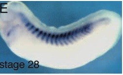 ccn2 (cellular communication network factor 2) gene expression in Xenopus laevis embryo via in situ hybridization, NF stage 28,lateral view, anterior left, dorsla up.