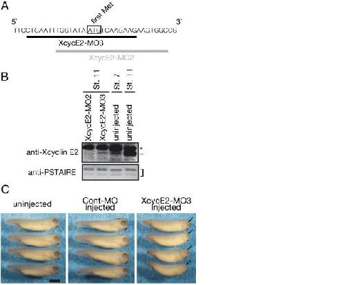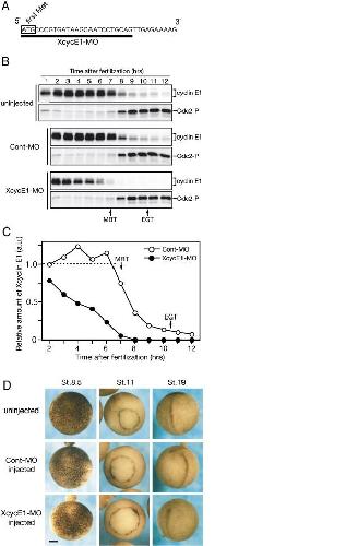 Xcyclin E1 is dispensable for development after MBT. (A) A morpholino oligo for Xcyclin E1 (XcycE1-MO) was targeted to the underlined sequence. The box indicates the start codon. (B) One-cell stage embryos were uninjected or injected with 80 ng of either control MO (Cont-MO) or XcycE1-MO, cultured, collected at indicated times, and analyzed by Western blot with anti-Xcyclin E1 or anti-phospho-Cdc2-Tyr15 (Cdc2-P) antibodies. (C) The Xcyclin E1 signals shown in panel B were quantified by phosphoimager. (D) Embryos as in panel B were photographed when uninjected control embryos reached the indicated stages. Note that neural tube was not still closed in XcycE1-MO-injected embryos when uninjected embryos reached stage19. Scale bar, 250 μm.
