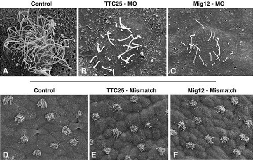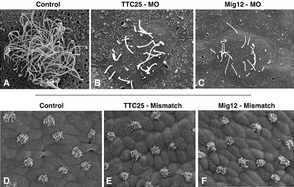 Fig. 10. SEM confirms suppression of ciliogenesis in Mig12 and TTC25 morphants. (A) High magnification view of a control cell shows multiple, long cilia on the apical cell surface. (B, C) TTC25 morphants and Mig12 morphants both exhibit fewer, shortened apical cilia. (DâF) Five-base-pair mismatch morpholinos for TTC25 and Mig12 exhibit no ciliogenesis defects.
