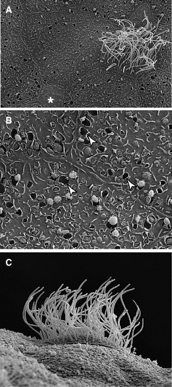 Fig. 2. Ultrastructure of the Xenopus epidermis. (A) View of mucociliary epithelium including a ciliated cell, small secretory cell (marked by â) and several large goblet cells. (B) Goblet cells contain empty vesicles, noted with arrowheads, and vesicles with secretory granules being exocytosed. (C) Lateral view of a ciliated cell, showing the many motile, apical cilia.
