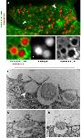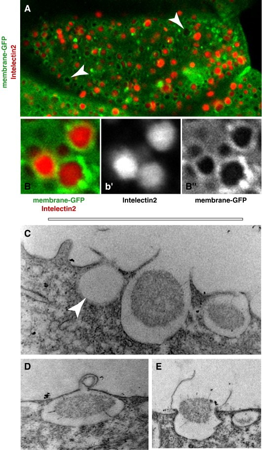 Fig. 4. Goblet cells in the Xenopus epidermis secrete Intelectin-2. (A) A Xenopus epidermis goblet cell; membrane-GFP (green) reveals the extensive exocytic vesicles; antibody staining demonstrates the presence of intelectin-2 (red) in these vesicles. Arrows mark vesicles absent of intelectin-2. (BâBâ²) High magnification of exocytic vesicles shown in panel A. (CâE) Transmission electron microscopy of a Xenopus epidermis goblet cell. (C) Three apically located vesicles at different stages of exocytosis are visible in an epidermal goblet cell. A mucus granule can be seen in the process of being secreted. (D) Membrane fusion intermediate during exocytosis. (E) Exocytic release.