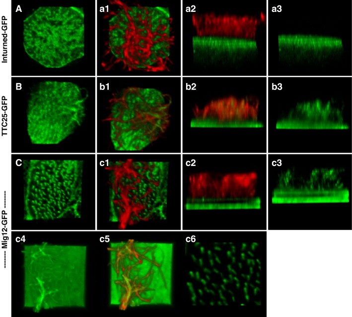 Fig. 7. Mig12 and TTC25 localize to basal bodies and ciliary axoneme. Inturned-GFP, shown here as a reference, is localized at the apical surface of the ciliated cell, but is not in the ciliary axoneme (Aâa3). TTC25-GFP localizes to apical foci, presumably basal bodies, and also to the ciliary axoneme (Bâb3). Mig12-GFP localizes to both basal bodies and the ciliary axoneme (Câc3). At normal gain levels, Mig12-GFP localizes very specifically to the basal bodies (C), clearly marking basal body orientation and ciliary polarity (c6). At high gain levels, the presence of Mig12-GFP in the ciliary axoneme is more apparent (c4âc5).