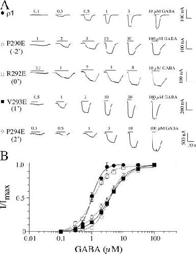 Figure 2. Dose–response relationships for selected glutamate scan mutants. (A) GABA-gated currents at a range of agonist concentrations in oocytes expressing the indicated mutants are shown. (B) Maximum current amplitudes were plotted as a function of GABA concentration and fitted with the Hill equation (Eq. 1 in Materials and methods). Parameters from these fits are provided in Table I. In general, the mutations had a modest effect on agonist sensitivity.