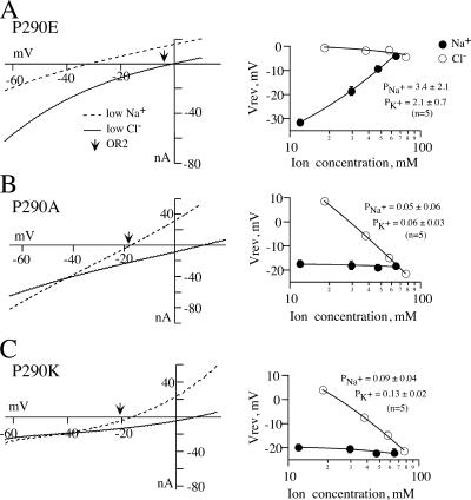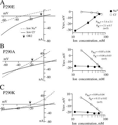Figure 3. A negatively charged substitution at P290 (−2′) results in cation-preferring receptors. (A) Amplitudes of GABA-induced currents from P290E were measured at a continuously varying membrane potential using the ramp protocol described in the Materials and methods. Ramps obtained in low sodium OR2 are the dashed lines and those in low-chloride OR2 are the solid lines. The normal OR2 ramp is omitted for clarity, but the reversal potential is indicated with an arrow. For the graph on the right, reversal potentials were measured at different concentrations of sodium (solid) or chloride (open) and fit with the GHK equation (Eq. 2) to determine the relative permeability coefficients. Substitution of negatively charged glutamate for the native proline at position 290 (−2′) resulted in cation-preferring receptors, but receptors were chloride selective when this site was mutated to neutral alanine (B) or positively charged lysine (C).