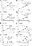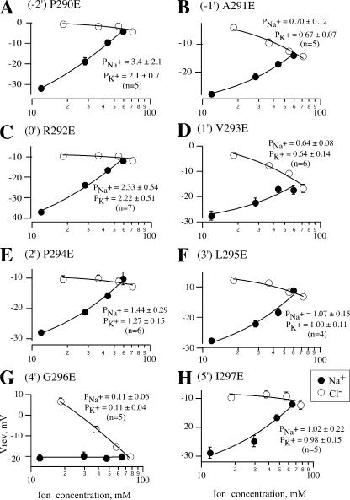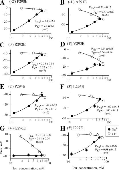 Figure 4. Glutamate scanning reveals a pattern that alternates between cation and nonspecific permeability. (A–H) For each indicated glutamate mutant, reversal potentials were measured in solutions with different concentrations of sodium (solid) or chloride (open). Lines are GHK fits to the data. Reversal potentials were nearly unaffected by chloride concentration in mutants that are cation preferring (A, C, and E), while for nonselective mutants the reversal potentials were shifted by changes in sodium or chloride concentration (B, D, G, and H). Systematic substitution of glutamate for each amino acid from −2′ to 5′ exhibited a nearly alternating pattern of cation-preferring receptors and nonselective receptors.