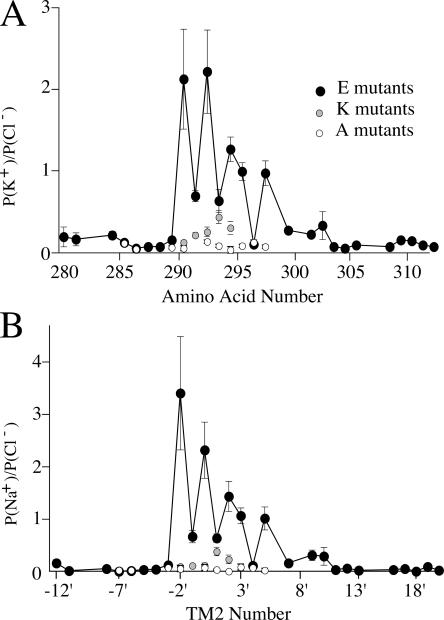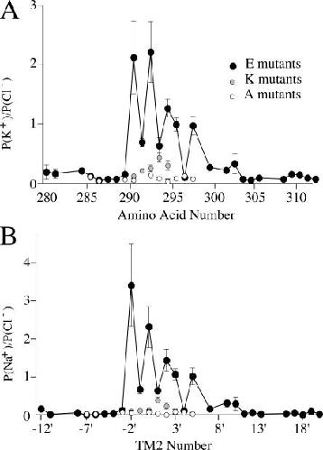 Figure 5. Alternate glutamate mutants at the intracellular end of TM2 are cation preferring. (A) Relative potassium permeability plotted against amino acid number shows the alternating pattern of cationic glutamate mutants (solid circles). Substitutions by positive lysine residues (gray circles) resulted in only small increases in potassium permeability. Substitution by neutral alanines (open circles) had no significant effect on ionic permeabilities. (B) Same as A, showing relative sodium permeability of mutant receptors.