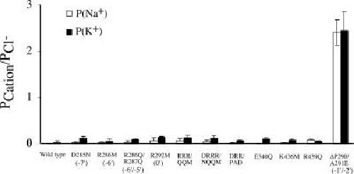 Figure 6. Endogenous charged residues in the wild-type receptor have little effect on ionic permeability. Charged amino acids at the intracellular membrane interface were neutralized to examine the role of native charges on ionic permeability. Although small elevations in relative cation permeability were evident, none of the constructs increased relative cation permeability to more than 0.15, in stark contrast to the previously described deletion of P290 and mutation of A291 to E (ΔP290/A291E), shown for comparison (Wotring et al., 2003). RRR/QQM is R286Q/R287Q/R292M, DRRR/NQQM is D285N/R286Q/R287Q/R292M, and DRR/PAD is D285P/R286A/R287D. For the latter case, the mutations were to the corresponding sequence in nAChR rather than a simple neutralization.