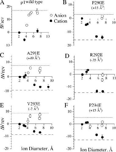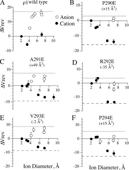 Figure 7. Glutamate substitutions do not alter the apparent pore size. (A–F) Reversal potentials were measured after substitution with anions (open symbols) and cations (closed symbols) of different diameters. The dashed and dotted lines indicate the calculated reversal potential shift for an impermeant anion or cation, respectively, and were based on the determined relative permeabilities for that particular mutant. For the wild-type receptor, the reversal potential shift approaches its maximum value for anions between 4 and 6 Å. Using this approximation, the data indicate that for all cases, the pore size was between 4 and 6 Å. The cations and their diameters (in Å) were as follows: cations, sodium, 1.9; rubidium, 3.0; cesium, 3.4; imadazole, 4.8; choline, 5.6; triethanolamine, 7.0; N-methyl-d-glucamine, 9.0; anions, bicarbonate, 4.1; acetate, 4.5; propionate, 5.1; gluconate, 6.9; isethionate, 7.0. Under the particular mutation, we provide the difference in side chain volume imparted by the substitution.