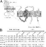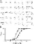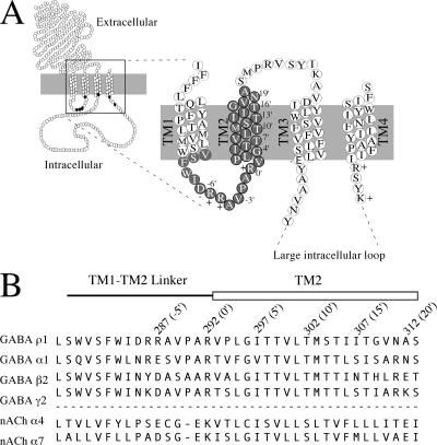 Figure 1. Diagram of proposed ρ1 GABA receptor subunit topology and transmembrane domain sequences. (A) Endogenously charged residues are indicated by the appropriate charge sign and these residues were neutralized in this study to examine the role of endogenous charges on ionic selectivity. The TM2 numbering system used in the manuscript begins with the 0′ TM2 arginine with increasing numbers proceeding toward the C terminus. Charge-scanning mutants covered the region from −12′ (intracellular valine, V) to 20′ (extracellular alanine, A) and are indicated with gray-filled circles. This figure is to merely show the extent of the residues examined in this study and the secondary structure or positions of these residues with respect to the membrane should not be taken literally. (B) Aligned TM1–TM2 linker and TM2 sequences from several representative members of the receptor family. Anionic members are above the dashed line, cationic members are below. The GABA ρ1 receptor sequence is human, all others are rat.