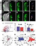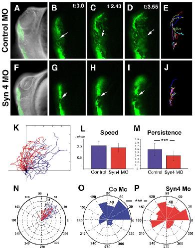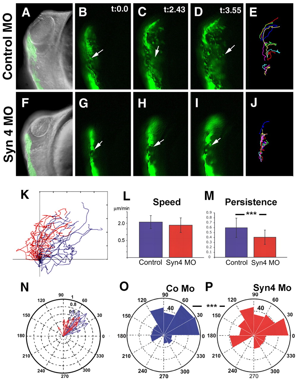Fig 5. Syn4 controls the persistence of NC migration. A sox10:egfp zebrafish transgenic line was used to analyze NC migration in vivo. (A-D,F-I) Time lapse of embryos at 16 hpf carried out for 4 hours, three frames (t=0.0 min, t=2.43 min and t=3.55 min) are shown; first frame is also overlapped with a DIC image. Dorsal to the left; anterior to the top. Arrow indicates an individual cell as an example. (E,J) Trajectories of 4 hours of migration. (A-E) Control MO; (F-J) syn4 MO. (K) Trajectories of cells from different experiments. Blue, control MO; red, syn4 MO. (L) Velocity of migration. (M) Persistence of migration. (N) Angle of migration for each individual cell. Blue, control MO; red, syn4 MO. (O,P) Rose plot showing the distribution of angles of each time point during the 4 hours of migration. The area of each bin represents the number of cells moving in that direction. (O) Control MO; (P) syn4 MO. ***P<0.005.