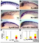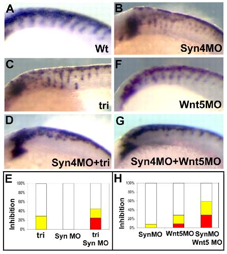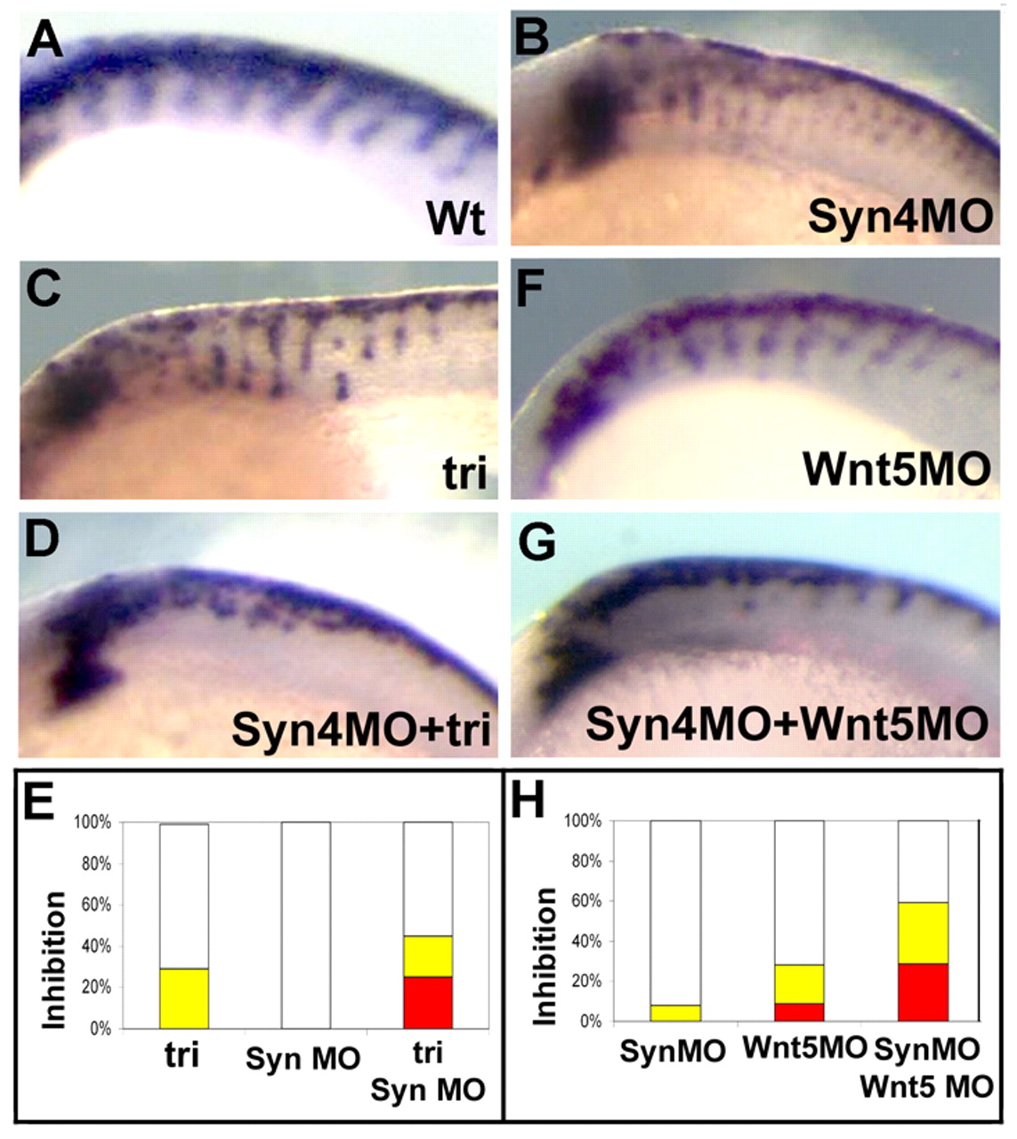 Fig 7. Interaction between Syn4 and PCP signaling. Zebrafish genetic interaction experiment. Lateral views of dorsal neural tubes of 20-somite zebrafish embryos are shown after crestin staining by in situ hybridization. Dorsal to the top; anterior to the left. (A) Wild-type embryo. (B) Wild-type embryo injected with 1 ng of syn4 MO. (C) tri mutant. (D) tri mutant injected with 1 ng of syn4 MO. (E) Percentage of inhibition of NC migration. White, no inhibition; yellow, mild inhibition; red, strong inhibition. (F) Wild-type embryo injected with 1 ng of wnt5 MO. (G) Wild-type embryo co-injected with 1 ng of wnt5 MO and 1 ng of syn4 MO. (H) Percentage of inhibition of trunk NC migration.