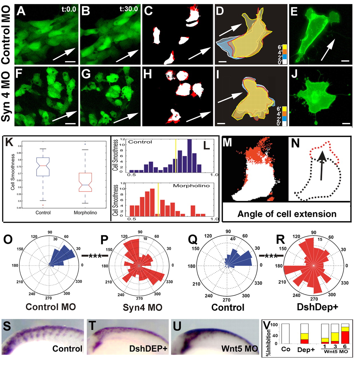 Fig 6. Syn4 and PCP signaling control the orientation of cell protrusions. (A,B,F,G) Time-lapse analysis of the mandibular NC stream of a sox10:egfp embryo at 18 hpf for 30 minutes. The initial and final frames are shown. Arrow indicates the expected direction of migration based on the orientation of the embryo. Cell extensions are shown in C and H in red. (D,I) Outline of individual cells at different times (minutes). (E,J) NC cells cultured in vitro, expressing membrane GFP. (A-E) Control MO; (F-J) syn4 MO. Scale bars: 25 μm in A,F; 10 μm in D,E,I,J. (K,L) Quantification of cell smoothness (CS) of NC cells. (K) Box-plot showing the distribution of CS values for control and syn4 MO-injected cells. A significant difference was observed (P<0.005). (L) Histogram of CS for control and syn4-MO injected cells. (M,N) Analysis of CE. (M) Two consecutives frames were subtracted, in a manner that the new growing area is shown in red and the unchanged area in white. A vector between the centroid of the cell and the centroid of the red area was drawn (arrow in N). (O-R) Rose plots showing the orientation of CE. (O) Control MO; (P) syn4 MO; (Q) control embryo; (R) embryo injected with DshDep+. Note the difference in scale. Scale bar: 20 μm; ***P<0.005. (S-V) Non-canonical Wnt signaling is required for zebrafish neural crest migration. Lateral views of dorsal neural tubes of 20-somite zebrafish embryos are shown after crestin staining by in situ hybridization. Dorsal to the top; anterior to the left. (S) Control; (T) 200 pg of DshDep+ mRNA; (U) 3 ng of wnt5 MO. (V) Percentage of inhibition in trunk NC migration. White, no inhibition; yellow, mild inhibition; red, strong inhibition.
