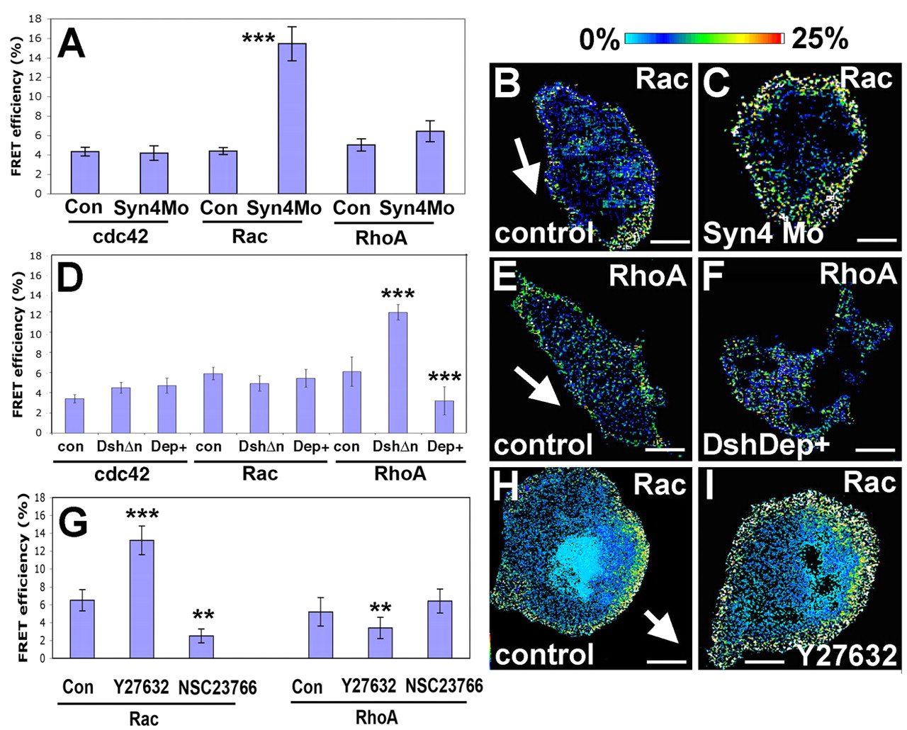 Fig 8. FRET analysis of Cdc42, Rac and RhoA activity in NC migrating in vitro after modification of Syn4 and PCP signaling. Embryos were injected with the probes for Cdc42, Rac and RhoA. Neural crest was dissected, cultured in vitro and FRET analysis performed. (A) FRET efficiency for Cdc42, Rac and RhoA in control or syn4 MO-injected NC cells. (B) Rac FRET efficiency for control NC. Arrow indicates the direction of migration, determined by time-lapse analysis of cell behavior immediately before fixation. (C) Rac FRET efficiency for syn4 MO NC. (D) FRET efficiency for Cdc42, Rac and RhoA in control or cells injected with 1 ng Dshδn or 1 ng DshDep+ (Dep+). (E) RhoA FRET efficiency for control NC. Arrow indicates the direction of migration. (F) RhoA FRET efficiency for DshDep+-injected NC. (G) FRET analysis for RhoA and Rac was performed after treatment with the RhoA inhibitor Y27632 or the Rac inhibitor NSC23766. (H) Rac FRET efficiency for control NC. Arrow indicates the direction of migration. (I) Rac FRET efficiency for the cell treated with Y27632. ***P<0.005; **P<0.01. Scale bar: 10 μm.