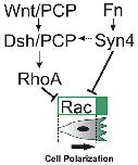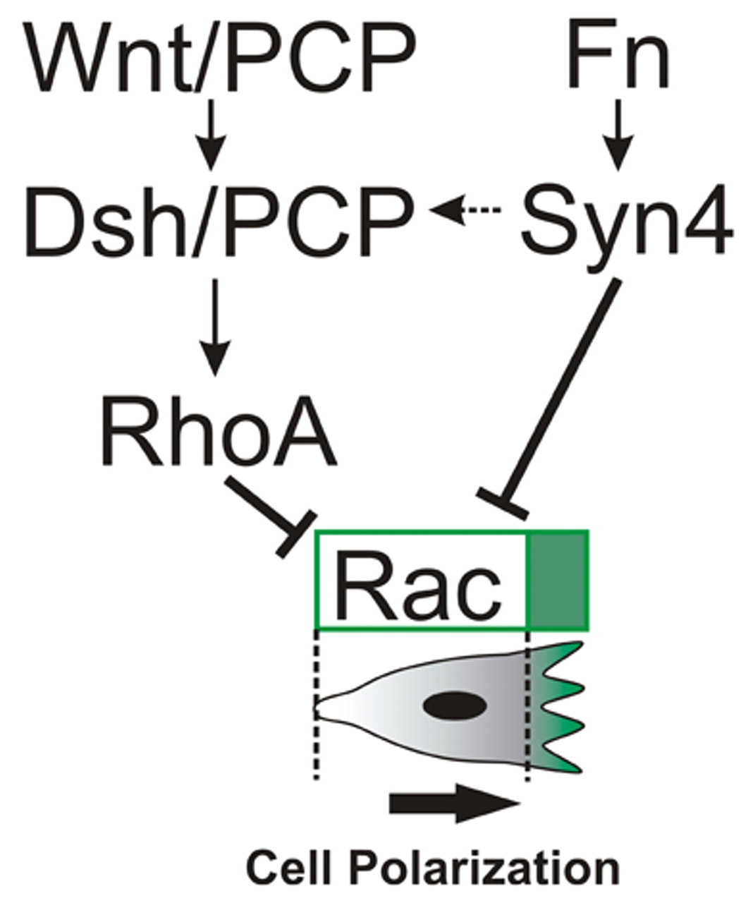 Model of NC polarization by Wnt/PCP and Syn4. Non-canonical Wnt signaling (Wnt/Dsh/PCP) activates RhoA, which in turn inhibits Rac activity, whereas Syn4 (activated by Fibronectin, Fn) inhibits Rac activity directly. The concerted activation of these parallel pathways leads to the inhibition of Rac (green) at the back of the cell, with the consequent formation of cell protrusions at the front of the cell and directional migration (thick arrow). There is also evidence of an interaction between Syn4 and Dsh (broken arrow).