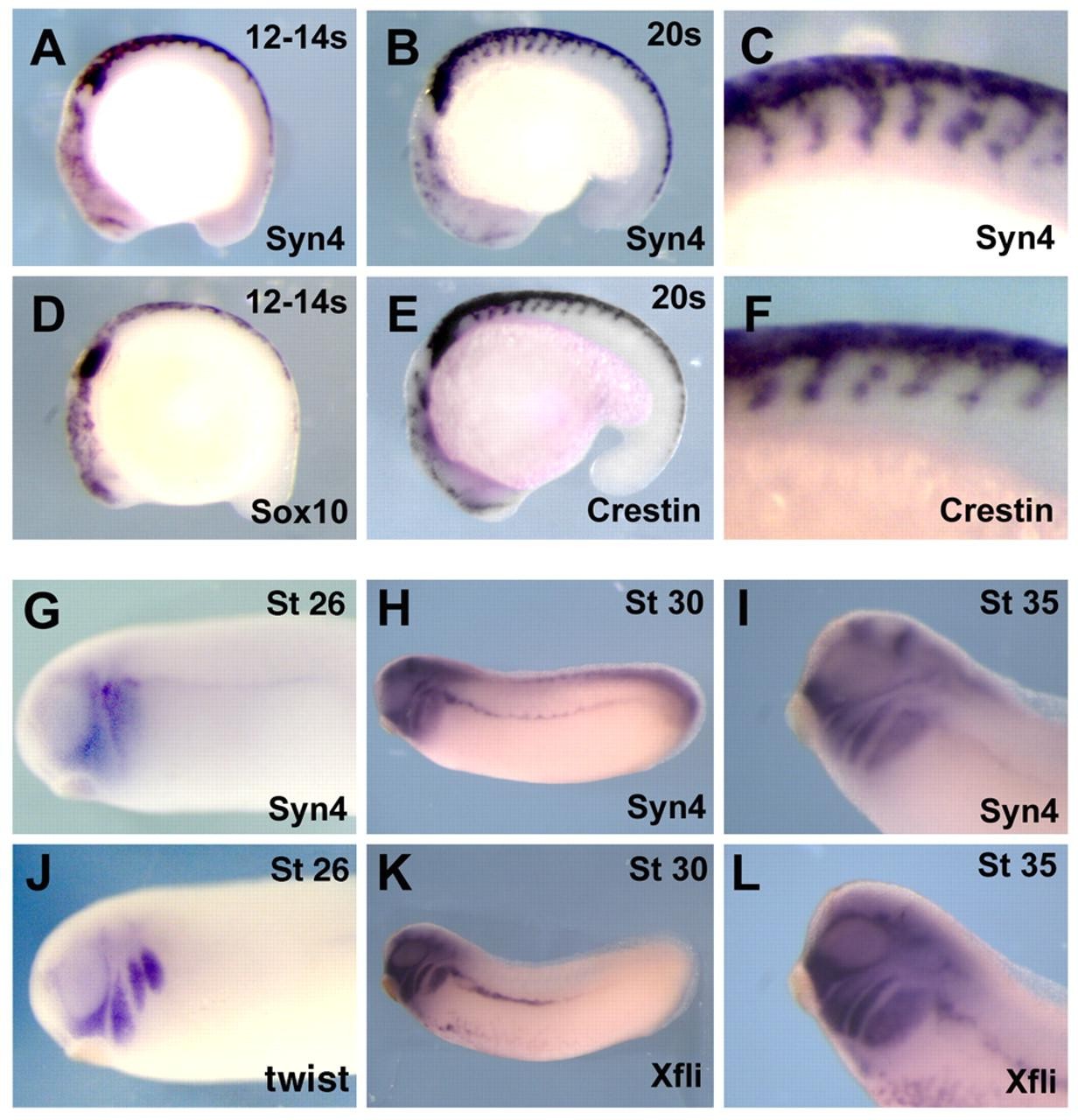 Fig. 1. syn4 is expressed in the migrating NC. (A-L) Lateral views of zebrafish (A-F) and Xenopus (G-L) embryos. Anterior is to the left. (A,D) 12- to 14-somite embryo. (B,E) 20-somite embryo; (C,F) higher magnification of the trunk region in B,E. (A-C) syn4 expression; (D) sox10 expression; (E,F) crestin expression. Note that the expression of syn4 in the migrating NC cannot be distinguished from the expression of the NC markers. (G,J) Stage 26 embryo. (H,K) Stage 30 embryo. (I,L) Cephalic region of a stage 35 embryo. (G-I) syn4 expression. (J) twist expression. (K,L) fli expression. Note the expression of syn4 in the migrating cephalic NC.