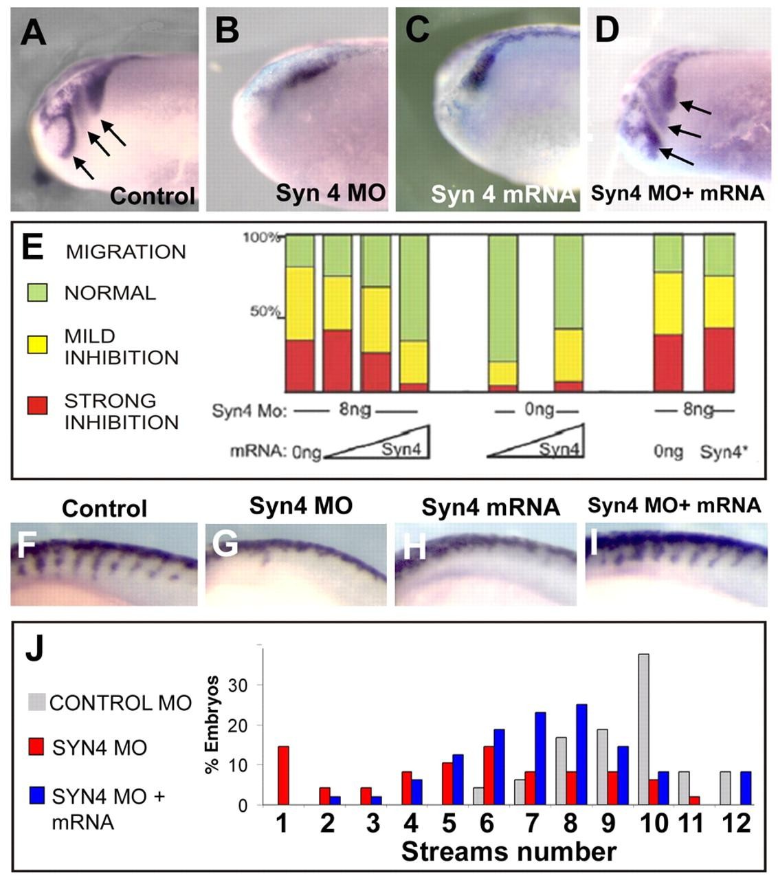 Fig. 3. Syn4 is required for NC migration. (A-D) Lateral view of Xenopus cephalic NC at stage 24, analyzed by the expression of snail2. Arrows indicate streams of migrating NC. (A) 8 ng control MO; (B) 8 ng syn4 MO; (C) 100 pg syn4 mRNA; (D) 8 ng syn4 MO and 100 pg syn4 mRNA. (E) Xenopus embryos were injected with 8 ng of syn4 MO together with 0, 25, 50 or 100 pg of syn4 mRNA (1st to 4th bar), 50 or 100 pg of syn4 mRNA only (5th and 6th bar), or 8 ng syn4 MO with 0 or 150 pg of syn4 mRNA mutated in the PKCα-binding site (Syn4*, 7th and 8th bar). NC migration was analyzed by the expression of snail2 at stage 24, as shown in A. Embryos were scored as a normal migration, mild or strong inhibition. Co-injection of syn4 mRNA rescues the inhibition of NC migration produced by the syn4 MO (1st to 4th bar), but no rescue is observed with Syn4 mutated in the PKCα-binding site (Syn4*, 7th and 8th bar). (F-I) Lateral view of zebrafish at 20 somites. Trunk NC migration was analyzed by the expression of crestin. Dorsal to the top; anterior to the left. (F) Control MO (6 ng); (G) syn4 MO (6 ng); (H) syn4 mRNA (250 pg); (I) syn4 MO and syn4 mRNA. (J) NC migration was analyzed by the expression of crestin when the embryo had 20 somites. The number of streams of NC migrating through the somites was counted. Co-injection of syn4 mRNA rescues the reduction in the number of streams of NC produced by syn4 MO.