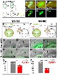 Fig 4.Syn4 is required for NC migration in a cell- and non-cell-autonomous manner. (A-Dâ²) Xenopus NC grafts. (A) Embryos were injected at the one-cell stage with 8 ng of syn4 MO and FDX; at stage 16, the NC were dissected, grafted into a normal host and NC migration was analyzed by looking at the fluorescence. (B,Bâ²) Control showing normal NC migration (87% of migration, n=15). (C,Câ²) syn4 5-base mismatch morpholino (syn4 5mm MO)-injected embryo, showing normal NC migration (75% of migration, n=12). (D,Dâ²) syn4 MO-injected embryo showing inhibition of NC migration (0% of migration, n=15). (E-P) Zebrafish graft embryos. (E) sox10:egfp embryos were co-injected with RDX and control or syn4 MO; cells taken from these embryos were grafted into wild-type embryos and NC migration was analyzed. (F) sox10:egfp embryos were injected with RDX; cells taken from these embryos were grafted into wild-type embryos previously injected with control or syn4 MO and NC migration was analyzed. (G-N) GFP-expressing cells were overlapped on DIC image. Black arrow indicates the initial position of the NC; white arrow indicates the position of the NC after 4 hours. (G-J) Control MO; (K-N). syn4 MO. (O) Average distance traveled for the grafted cells in 4 hours in experiment shown in E. (P) Average distance traveled for the grafted cells in 4 hours in experiment shown in F. **P<0.005.
