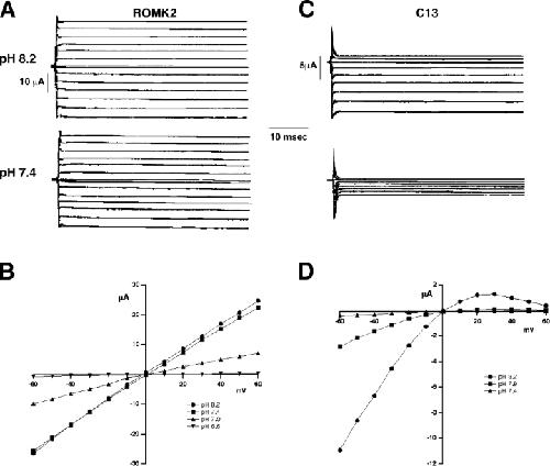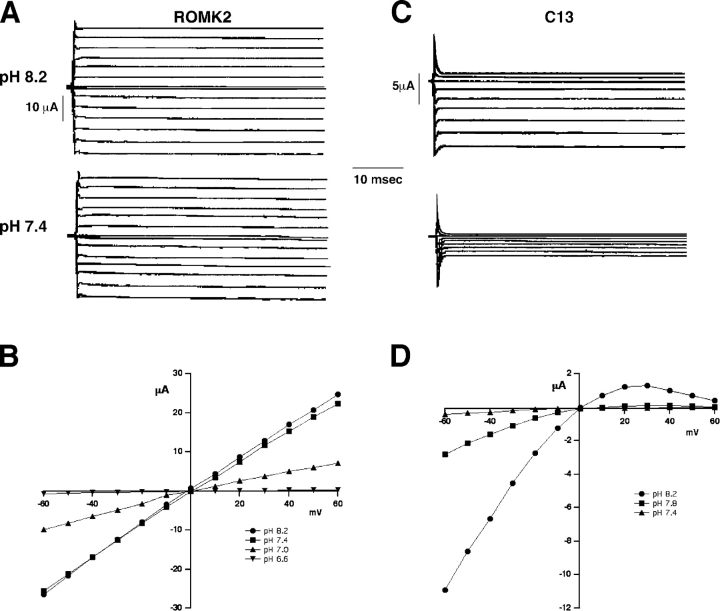 Figure 2. . pH dependence of ROMK2 and C13. (A and C) Current traces for ROMK2 and C13 at different extracellular/intracellular pH. External solutions contained 55 mM KCl and 55 mM K acetate adjusted to the indicated pH values. Holding potential was 0 mV. Currents were measured at test potentials of −60 to +60 mV. Reducing pHo from 8.2 to 7.4 had little effect on ROMK2 currents (A) but markedly reduced the inward currents through the C13 chimera (C). (B and D) Steady-state I-V relationships for ROMK2 (B) and C13 (D) at different pH.