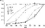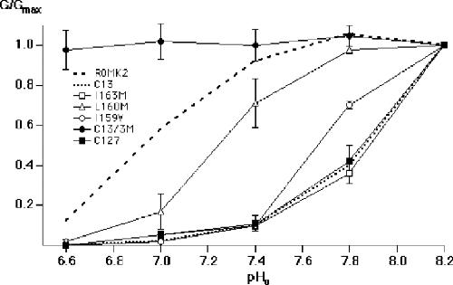 Figure 4. . pH dependence of inward conductance through the ROMK2 mutants I163M, L160M, and I159V and the C13 mutant “C13-3M” (C13 V159I/M160L/M163I). Conductance was measured and plotted as in Fig. 3 A. Data represent means ± SEM for 4–5 oocytes. Dashed and dotted lines show data for ROMK2 and C13, respectively, from Fig. 3 A.