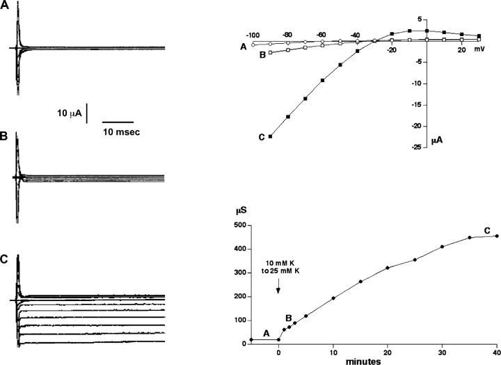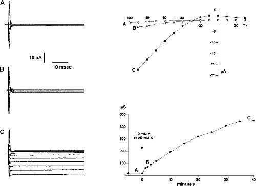 Figure 5. . Effect of external K+o on inward conductance through C13. (Left) Current traces for a C13-expressing oocyte in 10 mM K+ (A), 1 min after increasing K+ to 25 mM (B) and 40 min after the solution change (C). (Bottom right) Time course of inward conductance. (Top right) I-V curves at times A–C.