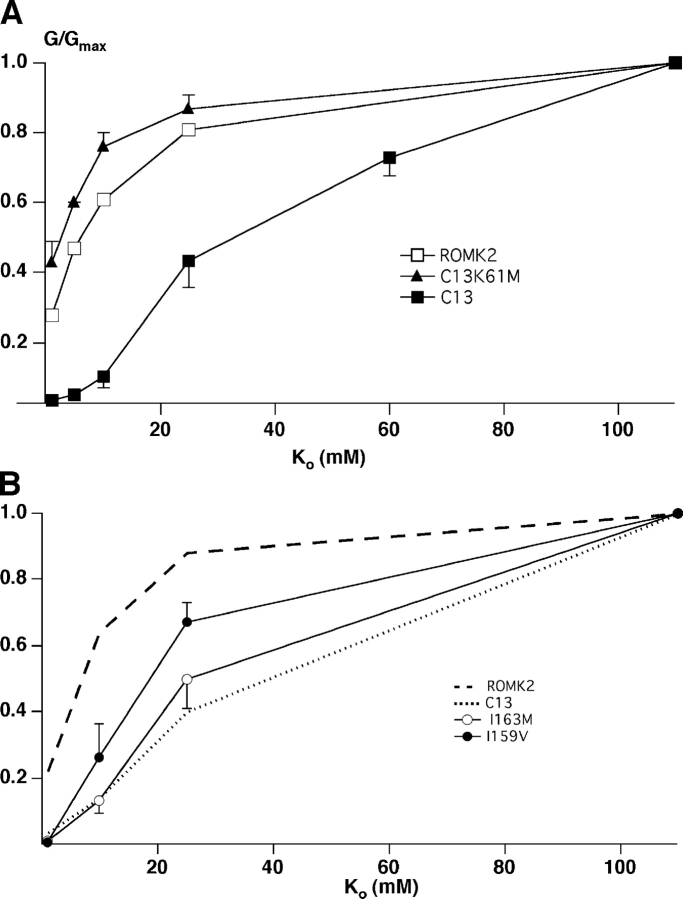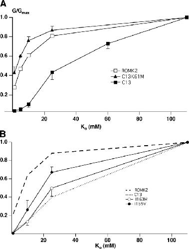 Figure 6. . Steady-state concentration-conductance relationships for ROMK2, C13, C13–3M (A), and for I163M and I159V (B). Oocytes were perfused with solutions containing KCl concentrations of 1–110 mM, substituting for NaCl. Data represent means ± SEM for 5–11 oocytes.