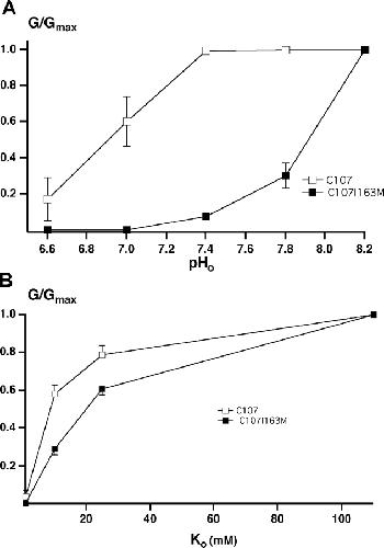 Figure 7. . Effect of pH and Ko+ on inward conductance through C107 and C107 I163M. (A) pH dependence. (B) Ko+ dependence. Data represent means ± SEM for five oocytes.