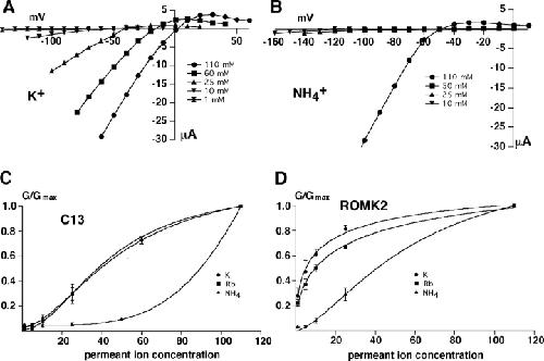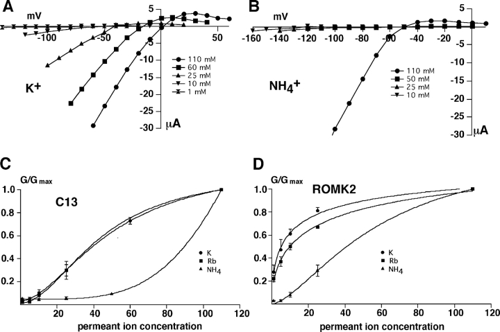 Figure 8. . Activation of C13 and ROMK2 channels by extracellular K+, Rb+, and NH+4. Oocytes were incubated in medium containing 1 mM permeant ion + 109 mM NaCl until a steady-state conductance was achieved. Permeant ion concentrations were then increased in steps up to 110 mM, substituting for Na+. Conductance was normalized to maximal values measured at the 110 mM concentration. (A and B) Current-voltage relationships for C13 with increasing concentrations of K+ (A) or NH4+ (B). (C) Conductance-concentration relationships for C13. (D) Conductance-concentration relationships for ROMK2. Smooth curves are drawn through the data points and have no theoretical meaning. Data represent the means ± SEM for 4–6 oocytes.