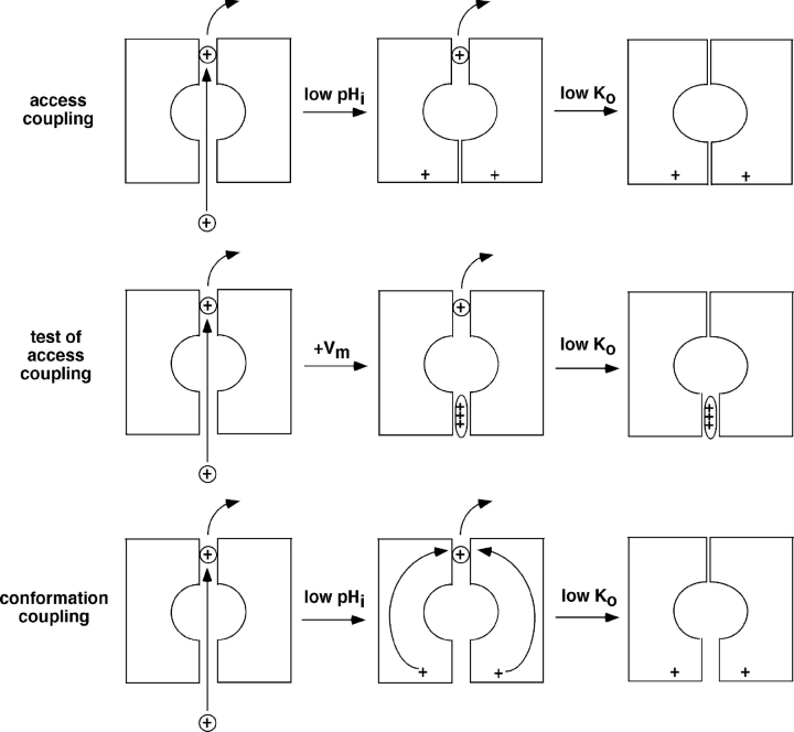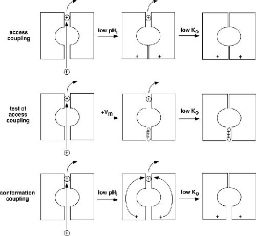 Figure 9. . Schematic representation of two possible mechanisms of coupling between inner and outer channel gates, and an experimental test of coupling through restricted K+ access.