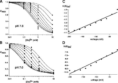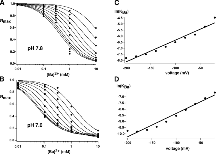 Figure 12. . Effect of pH on Ba2+ block of ROMK2 channels. Data were obtained in experiments similar to those shown in Fig. 5 using pHo 7.8 (A) and 7.0 (B). Best fits to the data using the equation described in Fig. 6 gave values of KBa(0) = 10.4 mM (pH 7.8) and 1.5 mM (pH 7.0). (C and D) Voltage dependence of block at pH 7.8 (C) and 7.0 (D). Values of δBa were 0.23 (pH 7.8) and 0.24 (pH 7.0), respectively.