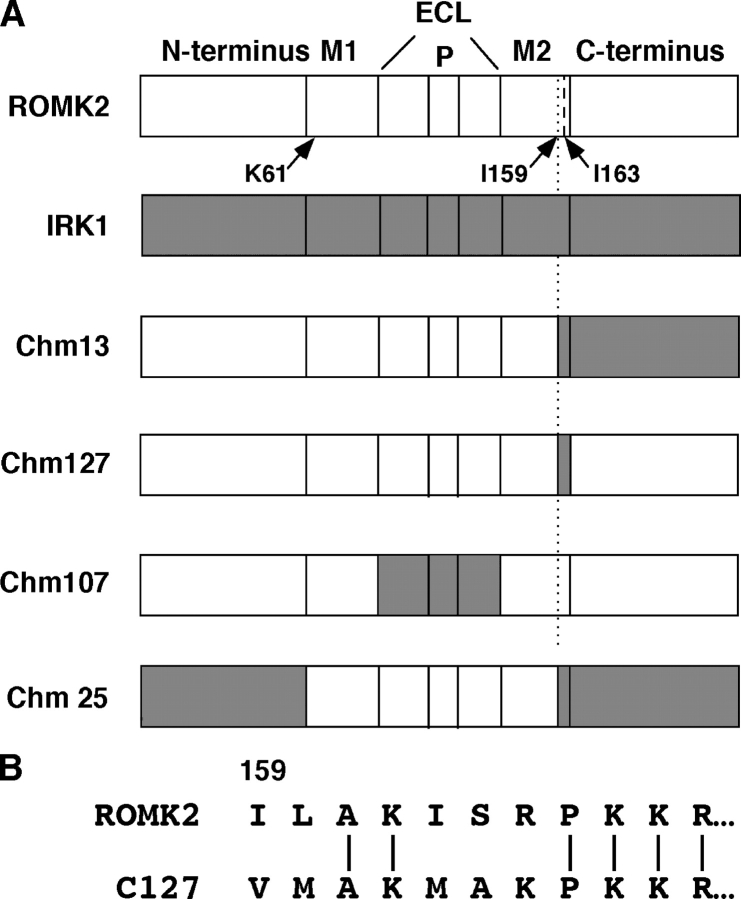 Figure 1. . ROMK2/IRK1 chimeras. (A) Each protein is divided into the cytoplasmic NH2 and COOH terminus, the two transmembrane domains M1 and M2, and the extracellular loop (ECL), which includes the pore region (P) containing the selectivity filter. Light segments represent components from ROMK2; shaded segments represent components from IRK1. Arrows indicate the positions of the three point mutations K61M, I159V, and I163M. (B) Sequence comparison of ROMK2 and C127.