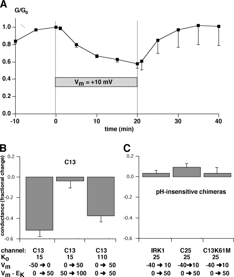 Figure 10. . Effect of a depolarizing holding potential on the inward conductance of strongly rectifying channels. (A) Time course of inward conductance changes with C13. Oocytes were superfused with solution containing 25 mM K. Inward conductances were measured between −60 and −80 mV with a holding potential of −40 mV, close to EK and the resting membrane potential. After a steady-state was achieved, the holding potential was changed to +10 mV, and the conductance continued measured at the same test potentials. After 20 min the holding potential was returned to −40 mV. Data represent means ± SEM for five oocytes. (B) Summary of experiments similar to those shown in A using C13 under different initial conditions, including initial holding potential and K+o concentration. (C) Summary of experiments similar to those shown in A using different pH-insensitive channels. The plots in B and C show fractional changes in conductance in response to a 50-mV depolarization. Data represent means ± SEM for 4–6 oocytes.