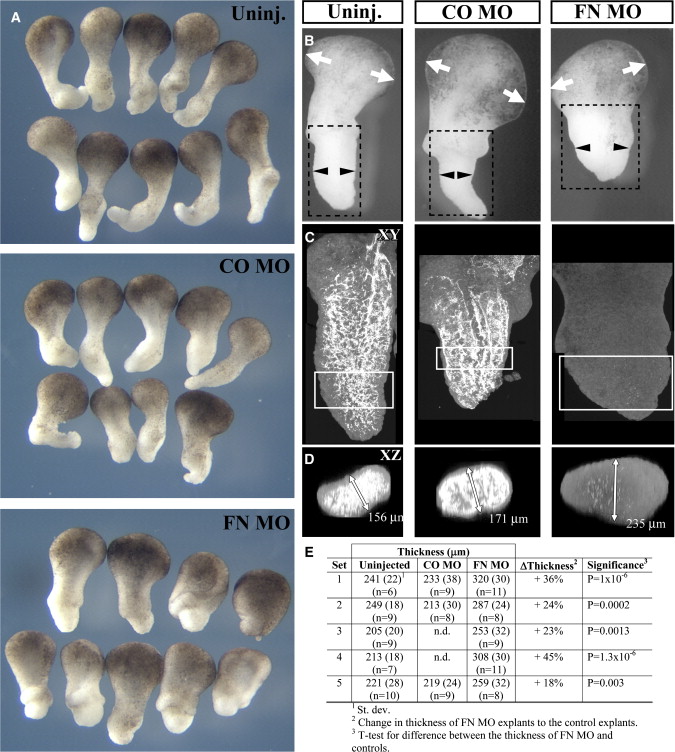 Figure 2. FN Knockdown Retards Blastopore Closure, Slows Convergence and Extension, and Produces Tissue Thickening and an Excess of Actin-Rich Cellular Extensions in Whole Embryos