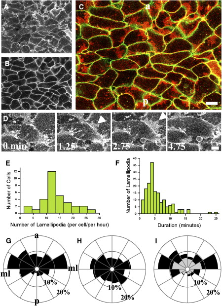 (I) Long-lived lamellipodia (black) are found at the mediolateral ends of cells whereas short-lived lamellipodia (gray) are more randomly oriented. Scale bar in (C) is 25 μm and in (D) is 10 μm (a, anterior; p, posterior; ml, mediolateral). This time-lapse sequence can be viewed in Movie S2.