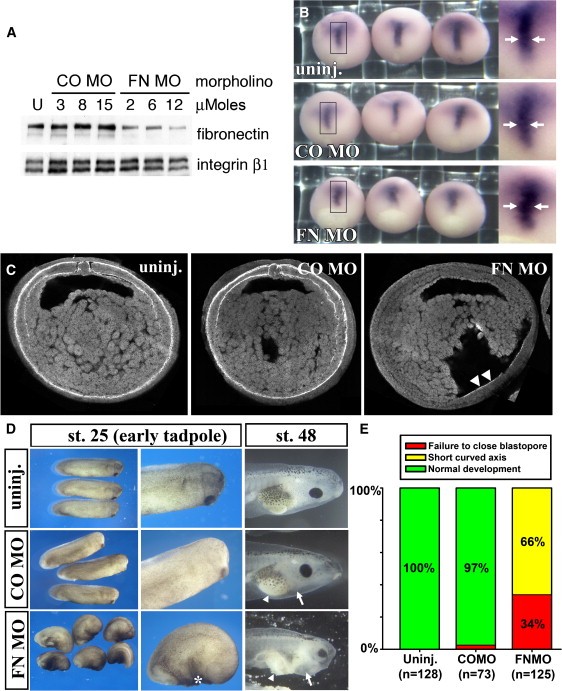 Figure 1. FN Antisense Morpholino âKnocks downâ FN Protein Synthesis, Reduces Fibril Formation, and Reduces Dorsal Axis Extension(A) Western blot analysis of morpholino (MO)-injected embryos harvested at stage 10.5 and processed for detection with the anti-FN mAb 4H2 and the anti-integrin β1 PcAb 363. The two FN bands correspond to two major alternatively spliced FN subunits expressed during development. The control MO has no affect on the levels of expression of either FN or integrin β1 at up to 15 μMoles MO injected per embryo. A dose-dependent reduction in FN protein expression is noted in the presence of the combined (50:50) FNMOs. Levels of integrin β1 protein expression are unaffected by the FN antisense MO.(B) Expression of chordin, a marker of dorsal axial tissues, shows that embryos injected with 15 μMoles FNMO have wide dorsal axial tissues. (Arrows mark the width of the chordin expression.)(C) Transverse confocal sections of embryos stained for FN fibrils show a typical pattern in both control morpholino and uninjected control embryos while fibril formation is almost completely abolished (see arrowheads for an example of faint labeling of blastocoel roof ectoderm in FNMO-injected embryos).(D) FNMO-injected embryos show defects in both dorsal and ventral elongation by early tadpole stages and severe anterior mesoderm defects by later tadpole stages. At early tadpole stages, the dorsal axial extension is moderately reduced while ventral extension is severely reduced (asterisk). Late-stage FNMO-injected tadpoles show defects in ventral mesoderm morphogenesis, ectodermal lesions, and failure of heart (arrow) and gut (arrowheads) formation.(E) Pooled data from three batches of embryos were observed over several days and their progress was assessed. None of the embryos injected with 15 μMoles FNMO develop beating hearts.