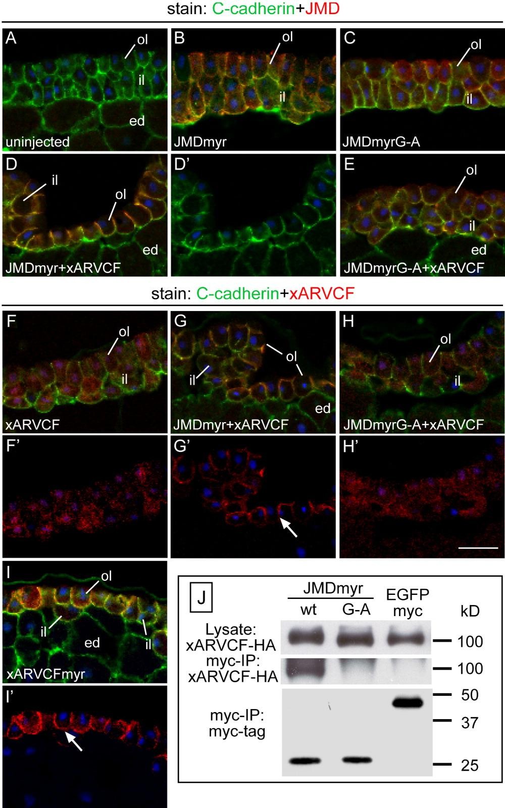 Figure 8. Plasma membrane localization of xARVCF is necessary and sufficient to disrupt adhesion. Animal caps of stage-10.5 embryos. Ol, outer cells; il, inner cells; ed, endoderm. Bar = 50 mu m. Sections were stained as follows. Green: C-cadherin; blue: nuclei; red: myc-tagged JMD constructs (B-E, 100 pg mRNA/inj.) or HA-tagged xARVCF (F-I, 250 pg/inj.). Red (D') and green (F'-I') channels were omitted to show cadherin and xARVCF distribution, respectively. A-E: Effect of JMDmyr on animal cap integrity: expression of JMDmyr (B) or JMDmyrG-A (C) alone has no detectable effect. Co-expression of JMDmyr+xARVCF causes inner cells to loose adhesion (D), but cadherin staining in the remaining outer layer is not affected (D', compare to control, A). Cells co-expressing JMDmyrG-A+xARVCF remain adherent (E, H). F-H: Effect of JMDmyr on xARVCF distribution. xARVCF expressed alone is mainly cytoplasmic (F, F'), but is titrated to the plasma membrane by JMDmyr (G, G' arrow). xARVCF co-expressed with JMDmyrG-A (H) shows a distribution similar to xARVCF alone. I, I': Inhibition of adhesion by direct membrane targeting of lipid-anchored xARVCFmyr. J: Coimmunoprecipitation of xARVCF with JMDmyr but not JMDmyrG-A. Immunoprecipitations were performed as in Figure 4. Loaded lysate corresponds to the equivalent of 1/8 embryo, loaded myc-IP to the equivalent of 4 embryos.