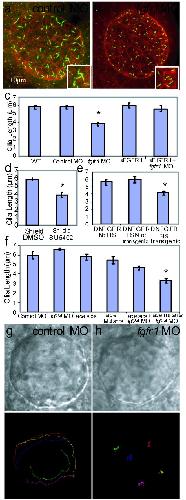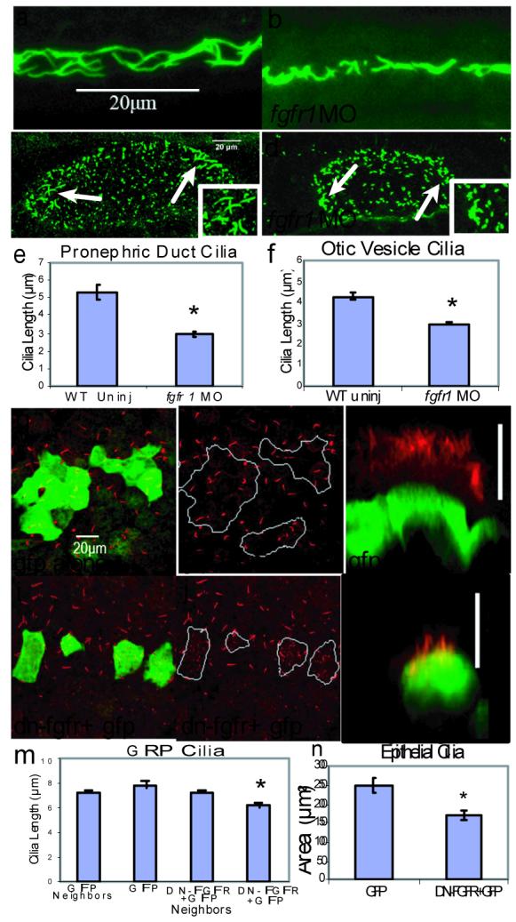 Figure 3. Cilia length in pronephric ducts, otic vesicles, gastrocoel roof plate epithelia and mucociliary epithelia is controlled by FGF signaling(a-b) Pronephric duct cilia were shorter and disorganized in fgfr1 morphants (p<4.24×10-4; 528 cilia; 10 embryos,) compared to WT (517 cilia; 10 embryos) 26 SS embryos. (c-d) Otic vesicle tethering cilia (arrows, and inset) were shorter (p< 1.10e-07) in fgfr1 morphants (325 cilia; 10 embryos) compared to WT embryos (322 cilia; 8 embryos) at 24 hpf. (g-j, m). GRP cilia in Xenopus embryos were normal length in cells expressing GFP alone (green cells in g, outlined in h; 316 cilia 18 embryos, p<0.11), neighboring cells (outside boundaries in h; 653, 18 embryos), and cells neighboring DN-FGFR+GFP expression (outside boundaries in j; 652 cilia 15 embryos, p<0.99). In contrast, GRP cilia were shorter in cells expressing DN-FGFR+GFP (i, inside boundaries in j; 155 cilia, 15 embryos) compared to neighboring cells (p<6.1e-03) and cells expressing GFP alone (p<2.7e-03). (k, l) Z plane rendering of mucociliary epithelia (scale bar 20 um), showing shorter cilia in cells expressing DN-FGFR+GFP (13 cells, 7 embryos) compared to controls expressing GFP alone (14 cells, 4 embryos). (n) Multicilia area is reduced in cells expressing DN-FGFR+GFP (p<0.019). Error bars are s.e.m.