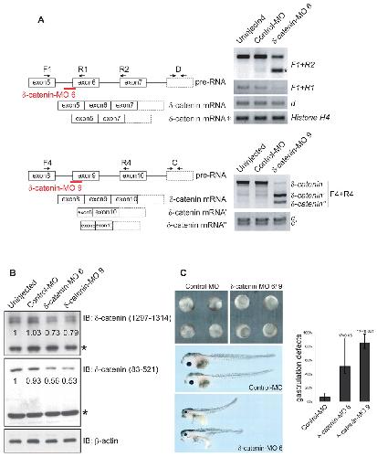Figure 5. Antisense morpholino depletion of endogenous δ-catenin results in developmental defects. (A) Schematic diagram of the morpholino-based strategy, including the relative positions of PCR diagnostic primers. MO 6 targets δ-catenin RNA at the splice junction between intron 5 and exon 6, whereas MO 9 targets the junction between intron 8 and exon 9. MO 6 produces exon 6 elimination, with predicted codon frame-shift and early polypeptide termination. In addition to the normal transcript, RT-PCR confirmed (via DNA sequencing) the expected alteration in pre-RNA splicing (using oligos F1+R2; marked with an asterisk). Likewise, MO 9 results in alternative splicing, exon elimination and translational termination (PCR product marked with a single apostrophe was confirmed to be skipping of exon 9 and part of exon 8. An additional partial exon 10 deletion is indicated with a double apostrophe). δ-catenin transcription and mRNA stability did not appear to be significantly altered (oligos D and C, see also Fig. 2A), with histone H4 serving as an internal control. (B) Immunoblotting of gastrula stage embryo extracts confirmed the reduction of δ-catenin protein following morpholino injection. Non-specific bands (labeled with asterisks) and β-actin act as loading controls. Numbers indicate relative band intensities normalized to the uninjected control. (C) δ-catenin knockdown results in developmental phenotypes, including significant delays in blastopore closures and gastrulation defects (upper right panel). Although most embryos outwardly appear to recover from these effects and complete blastopore closure, the majority of MO-9-injected embryos were developmentally arrested during early tailbud or tadpole stages and subsequently died. For surviving embryos, abnormalities were again outwardly evident, particularly at tadpole stages, including shortened anterior-posterior axes, smaller craniofacial skeletons and eyes, malformed gut and edema (lower panel). Control embryos injected with standard morpholino displayed no obvious phenotypes (upper left and middle panel). P-values indicate statistical significance. |